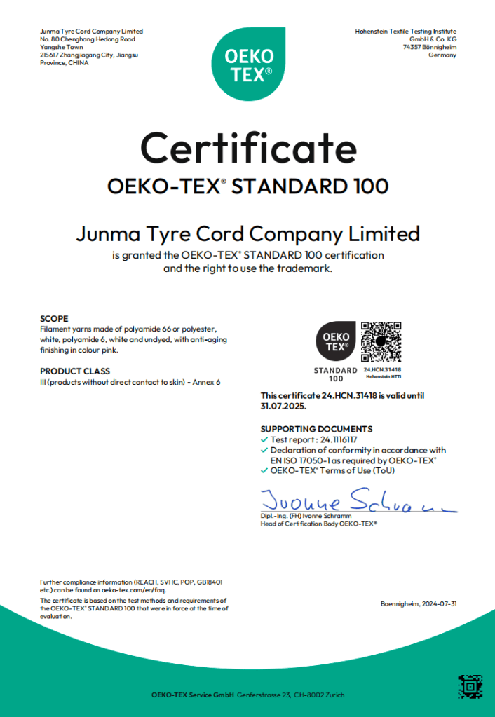 In addition to the certifications previously mentioned, we are proud to present : The OEKO-TEX® STANDARD 100 certification underscores our commitment to producing high-quality filament yarns with strict adherence to safety and environmental standards. Additionally, the Responsible Supply Chain Initiative (RSCI) certification reflects our dedication to ethical and responsible business practices throughout our supply chain. These certifications further demonstrate our unwavering commitment to sustainability, safety, and social responsibility, solidifying our position as a leader in the industry.”